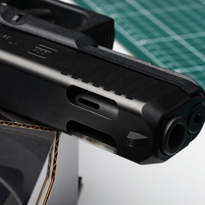 1.) We precision cut twin vertical ports in your barrel, aligned with matching twin cuts in the slide — identical to the OEM Glock “C” models.