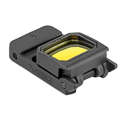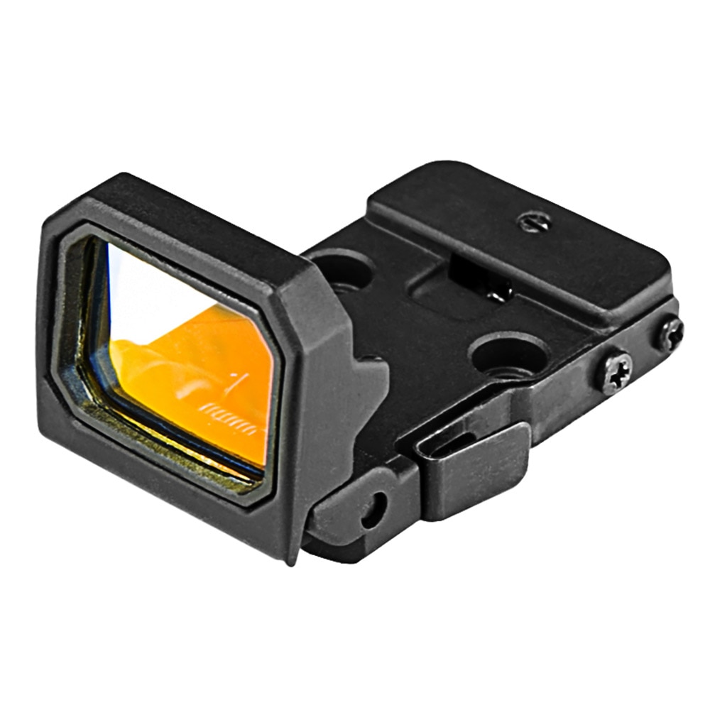 The FlipDot Patented folding Red dot reflex lens (22mm X 16mm) folds down flat when not in use. With a push of a button the FlipDot lens flips up and automatically turns on. The 3 MOA Red dot is fully adjustable for windage and elevation. Folding the lens down turns the optic off.