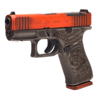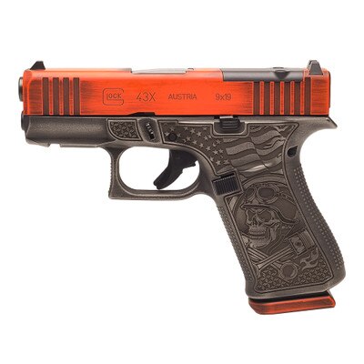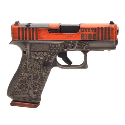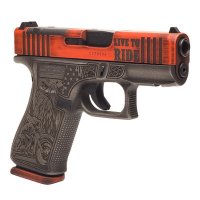 This Glock 43X MOS features a distressed orange Cerakote slide and intricate motorcycle themed engravings on both sides of the frame, this limited edition handgun stands out in both form and function. Optic-ready and equipped with a front accessory rail, it offers versatility for attachments and quick target acquisition. Built on the reliable G43X MOS platform, this unique model is perfect for enthusiasts seeking a distinctive, high-performance firearm. Elevate your collection with the Live to Ride G43X MOS a true masterpiece of craftsmanship and design.