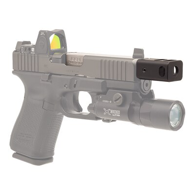 The included Gen. 5-specific compensator is crafted from black Type III hard coat anodized aluminum, designed to contour seamlessly with the Gen 5 bullnose slide. At 1.25" in length, it effectively reduces recoil and muzzle rise for faster follow-up shots.