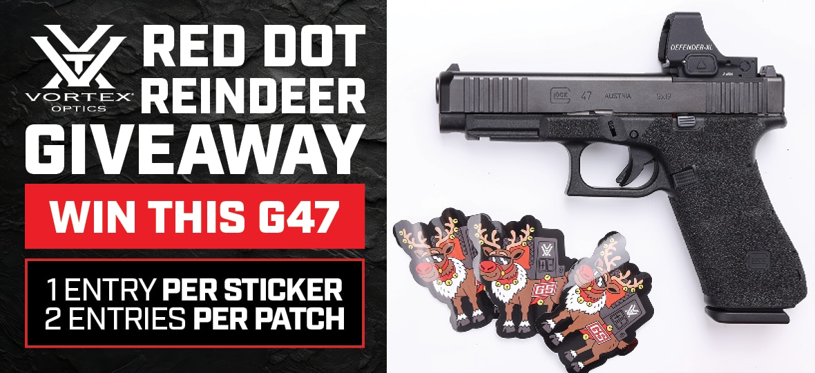 Every approved order that contains either a Red Dot Reindeer Sticker (#5349) or Patch (#5350) placed between Dec. 1, and Dec. 31, 2025, will also be an auto entry to win a Glock47 MOS with HandleItGrips; our new & improved Thug Plug; and the Vortex Defender XL!